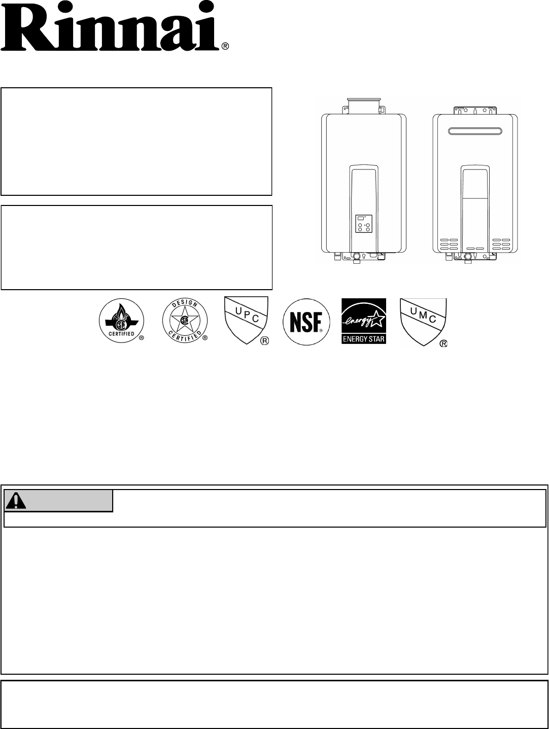 Direct Vent Tankless Water Heater Installation and Operation Manual FOR INDOOR APPLICATIONS ONLY RL75i..................... REU-VC2528FFUD-US REU-VC2528FFUD-US(A) RLX94i................... REU-VC2737FFUD-US RL94i..................... REU-VC2837FFUD-US FOR OUTDOOR APPLICATIONS ONLY RL75e .................... REU-VC2528WD-US REU-VC2528FFUD-US(A) RL94e .................... REU-VC2837WD-US ANS Z21.10.3 ● CSA 4.3 READ ALL OF THE INSTRUCTIONS THOROUGHLY BEFORE INSTALLING OR OPERATING THIS WATER HEATER.