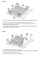 STEP 17 1. With a nail or screw mark the 4 holes on the wall that will be used to attach the plastic wall anchors(O) and anchor screws(P). 2. Drill the holes on the wall where you have marked the 4 spots in step 1 above. 3. Insert 4pc Plastic wall anchor(O) into the holes on the wall using your hand or small hammer. 4. Insert 4pc Long screw(P) through the holes on the Lower and upper side panels, then tighten to the Plastic wall anchor(O). 5. Put the Shelf(7) onto the Plastic holders(L).
