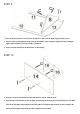 STEP 9 1. Place Shelf(8) in position as shown above to prepare to attach to both upper support boards(11),(12). 2. Insert 2 screws (I) through holes in the shelf (8) then tighten to the Left upper support board(12) and Right upper support board(11) by using a Philips screwdriver. 3. Insert 2 wood dowels(C) into the dowel holes on the Shelf(8). STEP 10 1. Insert 2pc of the wood dowels(C) into the dowel holes in the two Shelf(16) parts. 2.