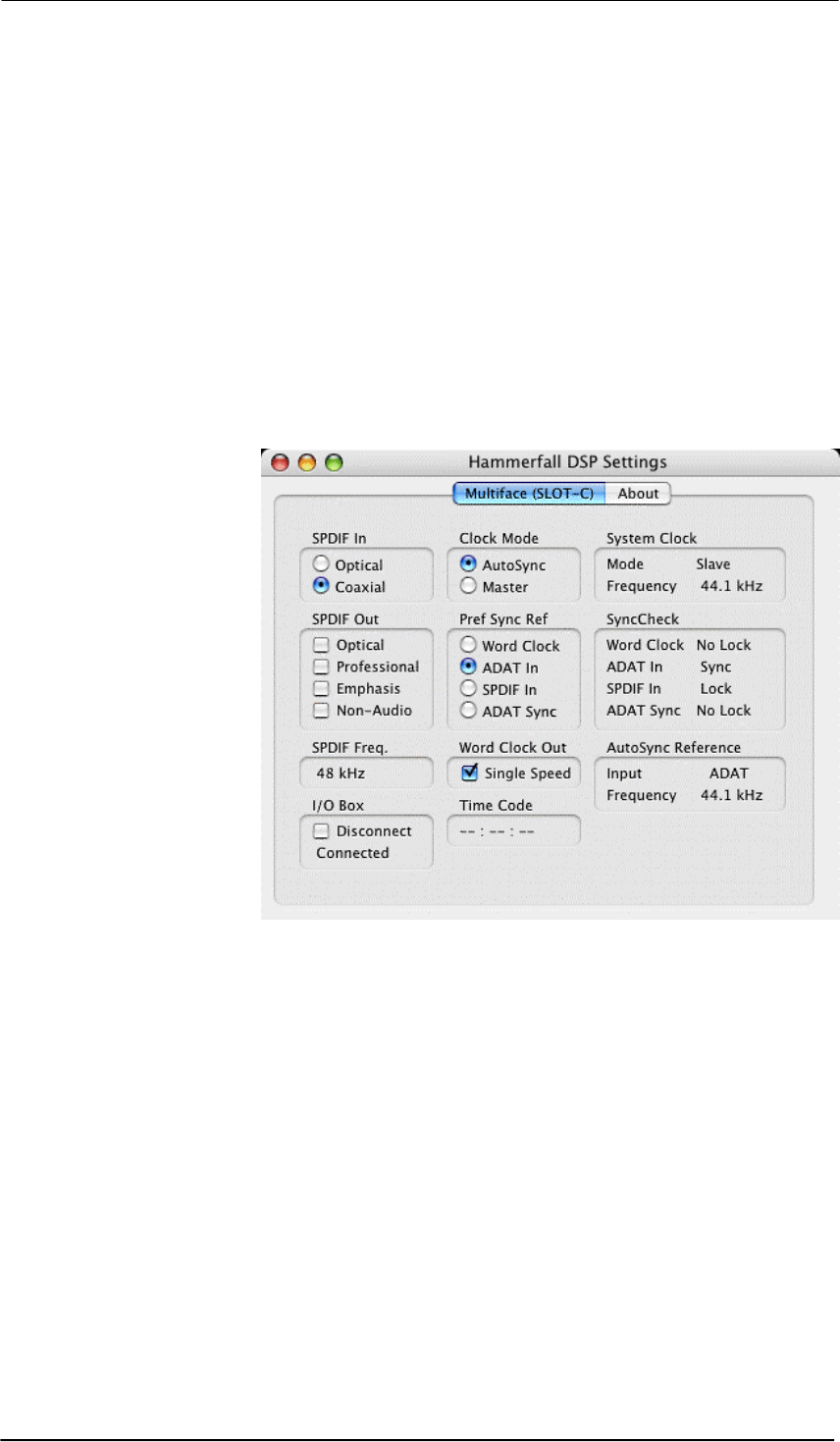 Configuring the Multiface II is done via its own settings dialog. The panel 'Settings' can be