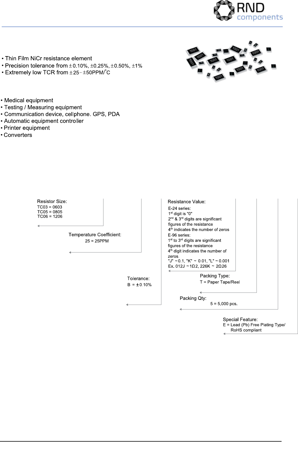 Thin Film SMD Resistors Features Applications Ordering Procedure RND 155 _______________ 0 6 T C 2 5 _______ C __ 1 0 0 J _______________ T __ Distrelec Schweiz AG, Grabenstrasse 6, 8606 Nänikon, Switzerland, T +41 44 944 99 11, info@distrelec.com, distrelec.