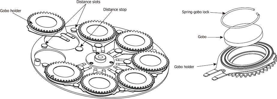6. Insert the gobo holder back under the distance slots into rotating gobo wheel