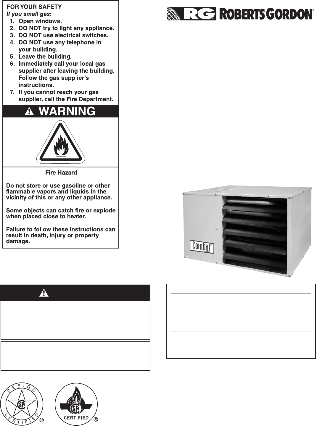 Attach this information to the wall near the ROBERTS GORDON® heater ® Read the Installation, Operation and Service Manual thoroughly before installation, operation or service. WARNING OPERATING INSTRUCTIONS 1. STOP! Read all safety instructions on this information sheet. 2. Open the manual gas valve in the heater supply line. 3. Turn on electric power to the heater. 4. Set the thermostat to desired setting (above ambient temperature). The automatic starting sequence begins. TO TURN OFF THE HEATER 1.