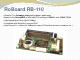 RoBoard RB-110 Size: 96 x 56mm Mini PCI USB USB System Power COM 2 (RS-485) Servo Power PWM S1~S16 LAN COM 6 (TTL, general function, FTDI Hi-Speed) COM 3 (TTL, Full-duplex) I2C COM 4 (TTL, Full-duplex) COM 1 (RS-232) Micro SD slot JTAG 1. 1000MHz, 256MB DDR2 2. PC compatible 3. Build in PWM/GPIO 16Ch 4. USB v2.0 ports 3 5. TTL COM ports 2 6. RS-232 port 1 COM 5 (TTL, Full-duplex, FTDI Hi-Speed) A/D 7. RS-485 port 1 8. FTDI Hi-Speed COM port 1 9.