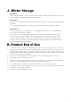 J. Winter Storage The Mower Fully charge the mower in its base station. Turn the mower off. Clean the mower and store it in dry indoor conditions at an ambient temperatures above 0°C. Base Station There are no special winter storage instructions for the base station. It can be left on the lawn during the winter. It is recommended that the power supply be disconnected from the mains during the winter.