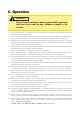 C. Operation WARNING Do not allow the mower to operate unattended if you know that there are or may be pets, children or people in the vicinity. 1. 2. 3. 4. 5. 6. 7. 8. 9. 10. 11. 12. 13. 14. 15. 16. 17. 18. Your robotic mower is a dangerous power tool. Exercise care when operating it and follow all safety instructions and warnings. In the event of an accident or malfunction during operation, press the red STOP control immediately.