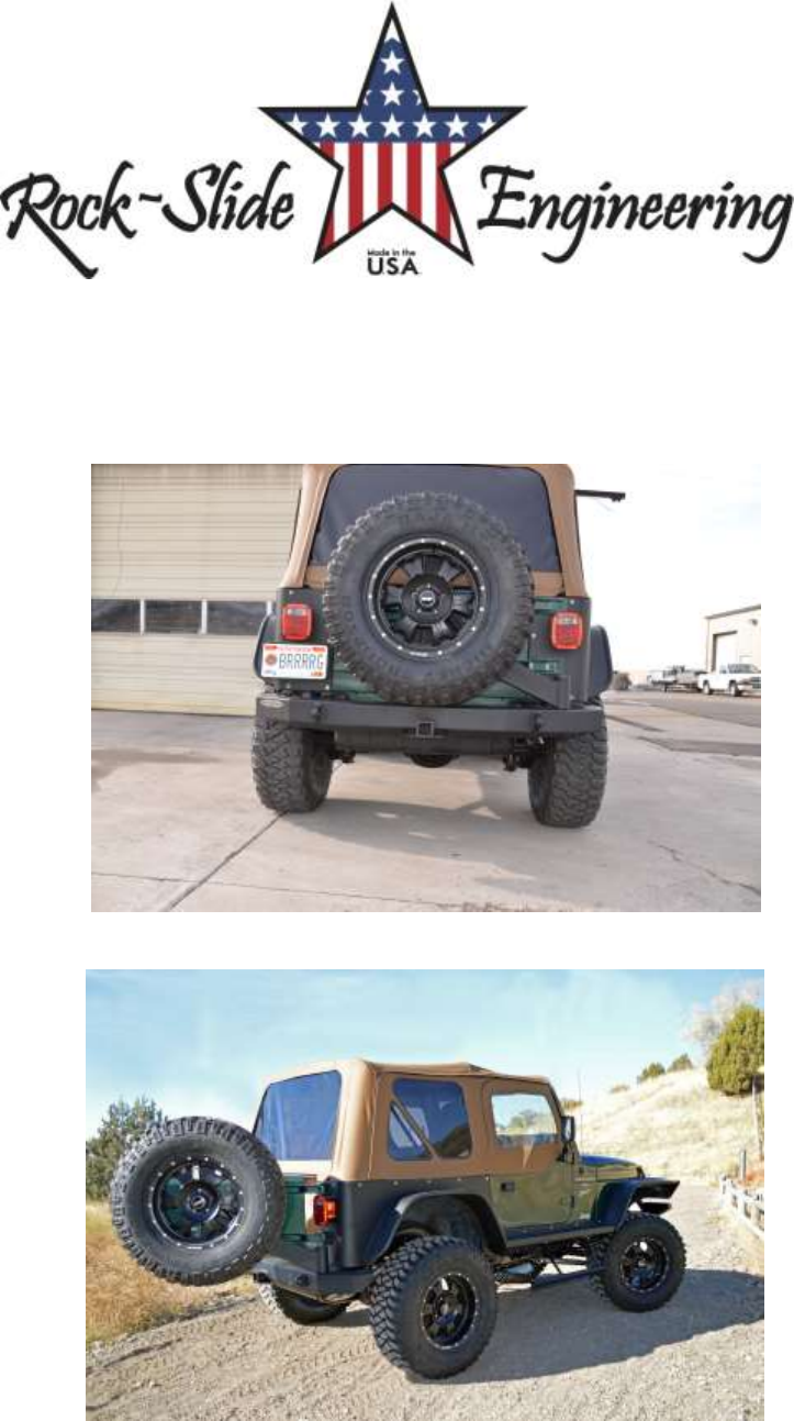 d. You should feel some pressure on the door just before it closes e. ***Do not over tighten as this could cause the tire carrier swing arm to bend the tailgate*** f. When the tailgate is closed, the spare tire should have no loose movement. If it moves when you try to rattle it, tighten the turnbuckle more g. **Take extra care that the tailgate opens and closes freely** 18. Perform a final check of all components to ensure proper fitment and torque. Thank you for choosing Rock-Slide Engineering products.