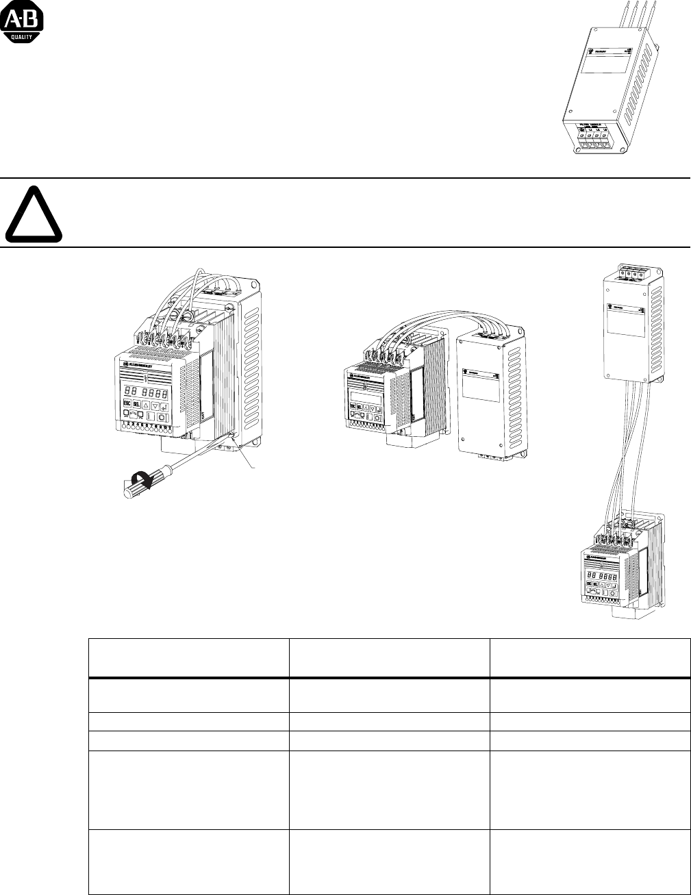 Line Filter Module (Cat 160S-RFA-6-A, -RFA-10-A, -RFA-16-A, 160-RFB-3-A, -RFB-9-A) Installation ! ATTENTION: To prevent electrical shock, disconnect from power before installing or servicing. High leakage current, connect to earth. OR 1.13 – 1.56 N–m (10 – 14 lb–in) Line Filter Module 160S-RFA-6-A OR M4 x 0.7 x 12mm LG. Rated Voltage/ Rated Current To Be Used with SSC Drive Type: 1~ / 200-240V / 6.