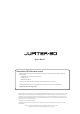 Owner’s Manual How to obtain a PDF of the owner’s manual PDF files of the owner’s manual and supplementary material for this product can be obtained from the Roland website. • JUPITER-80 Owner’s Manual (this document) • Parameter List * • MIDI Implementation * * These are not included with the product; you may download them as necessary. Visit the following URL, choose “owner’s manuals,” and search for the model name “JUPITER-80.” http://www.roland.