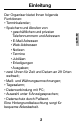 Einleitung Der Organiser bietet Ihnen folgende Funktionen: • Terminkalender; • Speichern und Abrufen von: • geschäftlichen und privaten Telefonnummern und Adressen • E-Mail-Adressen • Web-Addressen • Notizen • Termine • Jubiläen • Erledigungen • Ausgaben; • zwei Uhren für Zeit und Datum an 29 Orten weltweit; • Maß- und Währungsumrechnungen; • Tagesalarm; • Datenverbindung mit PC; • Auswahl unter 6 Anzeigesprachen; • Datenschutz durch Paßwort. Eine Hintergrundbeleuchtung sorgt für bequeme Ablesbarkeit.