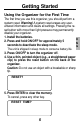 Getting Started Using the Organizer for the First Time The first time you use this organizer, you should perform a system reset. Warning! A system reset erases any userentered information and clears all settings. Pressing the reset button with more than light pressure may permanently disable your organizer. 1. Install the batteries. E 2. Press and hold ON/OFF for approximately 5 N seconds to deactivate the sleep mode. G The unit is shipped in sleep mode to conserve battery life. 3.