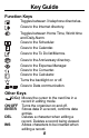 Key Guide Function Keys Toggles between 3 telephone directories. Goes to the Internet directory. 1 Toggles between Home Time, World time and Daily Alarm. Goes to the Scheduler. Goes to the Calendar. Goes to the To Do list/Memos. Goes to the Anniversary directory. Goes to the Expense Manager. Goes to the Converter. Goes to the Calculator. Turns the backlight on or off. Goes to Data communication. Other Keys (C/CE) Moves the cursor to the next line in a record in editing mode.