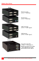 Models (Dual Video) REAR PS/2 Transmitter (4-DVI-I / 1-MiniDin6) PS/2 Receiver (2-DVI-I / 2-MiniDin6) USB Transmitter (4-DVI-I / 1-USB Type B) USB Receiver (2-DVI-I / 2-USB Type A) FRONT Transmitter (Front-All) (1-Power / 2-Fiber type LC) Bottom connector carries video 1 and keyboard/mouse data, top connector carries video 2.