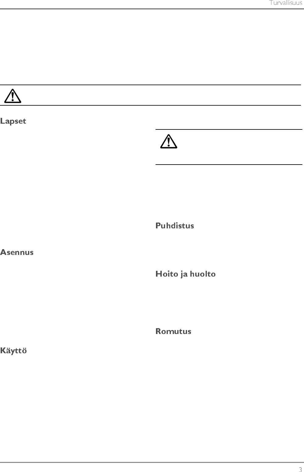 Teksti, joka on merkitty VAROITUSKOLMIO-symbolilla sisältää tietoa lieden turvallisesta käytöstä. LUE NE KOHDAT