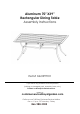 Product Description: Aluminum 70x39” Rectangular Dining Table Item # MLORTT101 PART QTY A PICTURE PART QTY 4 AA 14 B 1 BB 2 C 2 D 1 E 1 PICTURE ATTENTION: 1. 2. 1 To avoid damage of your new patio furniture, please use either the carton or another soft surface such as carpet as a working surface to prevent product scratches during assembly. To better line up assembly points, loosely tighten bolts until the furniture is fully assembled. Fully tighten bolts before use.