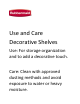 Use and Care Decorative Shelves Use: For storage organization and to add a decorative touch. Care: Clean with approved dusting methods and avoid exposure to water or heavy moisture.