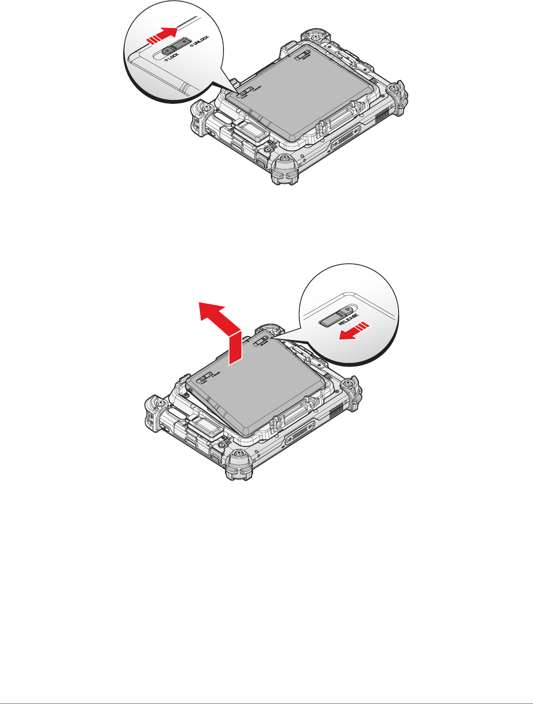 Operation Removing the External Battery 1. Press the locking switch on the top-left side to the unlock position. Figure 66. Unlock the External Battery 2. Press and hold the release button as shown in the image to release the battery. 3. Hold the battery and angle the top side up to remove. Figure 67.