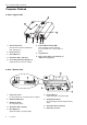 Runco CL-710/ CL-710LT User’s Manual Projector Outlook ❚ Front / Upper Side 1. Front Lamp Cover Remove this cover when replacing the lamp. (See page 27.) 2. Projection Lens 3. Front IR Sensor 4. Ventilation Holes (exhaust) 6. Power LED and Lamp LED Show the status of power and lamp. For more details, see "Control Panel" on page 5. 7. Top IR Sensor 8. Runco Logo (Can be turnedd off, see "Options" on page 24.) 5. Focus Ring and Zoom Ring Access Adjusts the focus and zoom of image.