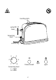 EJECT 8 To stop the toaster mid-cycle, press the 5 button. 9 The toast will pop up, and the elements will switch off. f FROZEN BREAD 10 Leave the browning level at your favoured setting, insert the frozen bread, lower the lever, then press the f button. 11 The f light will come on, and the toasting time will be altered automatically to give the same degree of browning you get with unfrozen bread. H EXTRA LIFT 12 After toasting small items (bagels, crumpets, etc.