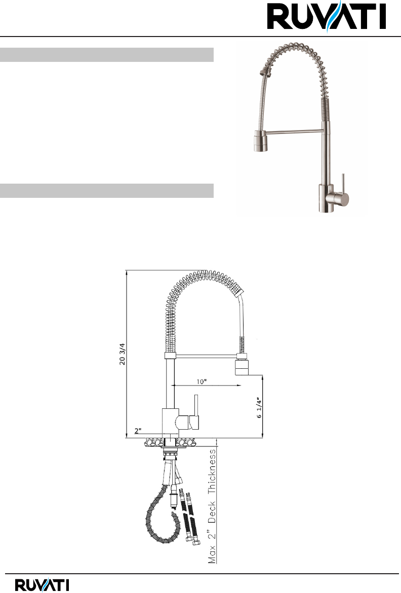 ® RVF1210ST Single Handle Pullout Kitchen Faucet Features • • • • • • • Stainless Steel Finish Ceramic valve cartridge Solid brass construction Pull-out spray head Single handle lever for easy use Up to 2” deck thickness 1 hole installation Dimensions • Overal Height: 20.75” • Spout Height: 6.25” • Spout Reach: 10” ® www.ruvati.