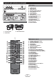 Controls and indicators 2 4 6 8 10 1 3 5 7 9 11 ON/STAND-BY X-BASS/EQ TUNER/AUDIO-IN USB CD ■ Front panel 1. 2. 3. 4. 5. Equalizer Button On/Standby Button Demo/ECO/Stop Button Tuner/Audio In Button Tuner Preset Down, Bluetooth/USB Track Down, Skip down, Auto Tuning Down 6. USB Play/Pause Button 7. Tuner Preset Up, Bluetooth/USB Track Up, Auto Tuning up 8. Bluetooth Play/Pause Button 9. Volume Down Button 10. X-Bass Button 11. Volume Up Button 12. Bluetooth pairing indicator 13. Remote sensor 14.