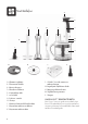 LV TRAUKA SALIKŠANA Salikšana PIRMS PIRMĀS LIETOŠANAS • Pirms miksera pirmās lietošanas noņemiet iepakojuma materiālu un reklāmas uzlīmes. Izdariet to, kamēr POWER (jauda) nav ieslēgta un ierīce nav pieslēgta elektrotīklam. • Esiet piesardzīgi, aizskarot blendera kātu, asmeņus un diskus, jo tie ir ļoti asi. • Blendera kātu, maisāmo trauku, vāku un visus piederumus mazgājiet ar siltu ziepjūdeni, izmantojot mīkstu lupatiņu. Rūpīgi noskalojiet un nosusiniet. 1.