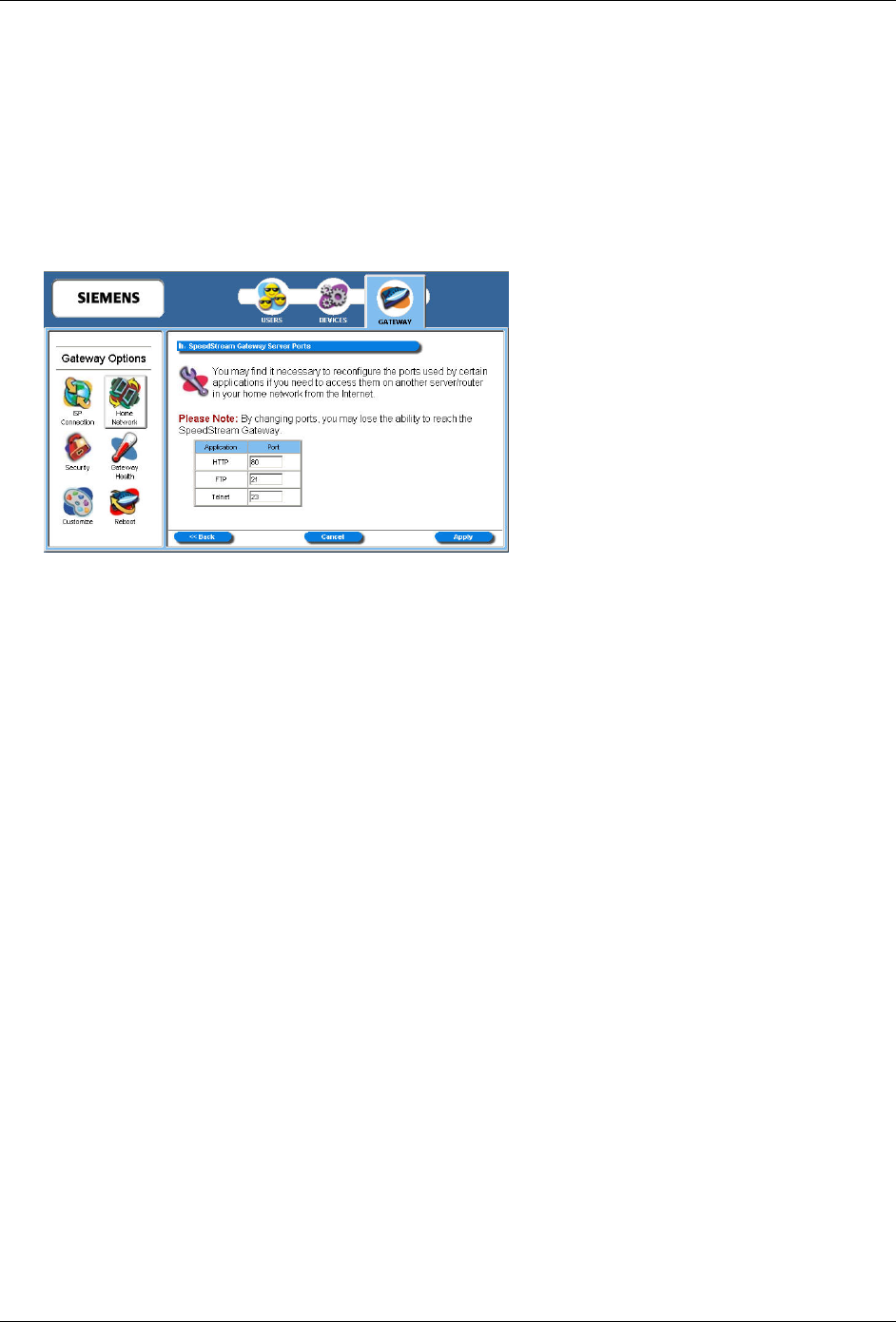 Residential Gateway Family User’s Guide Configuring Advanced Features Server Ports Common applications such as HTTP (Web site traffic), FTP, and Telnet use pre-defined incoming port numbers for compatibility with other services. If you wish to change the ports used by these applications you may do so using this option. This feature is recommended for use by advanced users only. To configure the server port option: 1. Click the Configure the Local SpeedStream Gateway Server Ports hyperlink.