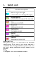1. Quick start Icon Explain Icon Function description Network signal strength: number of the more stronger the signal; Battery capacity number of the more power the more full; SMS SIM have unread SMS Missed call SIM have missed calls Used profiles The ringtone is silent Headset Plug in headset Key lock Show key and screen lock Install SIM card This phone supports one GSM SIM cards. Find SIM card’s groove in the back of the phone and slide it completely there.