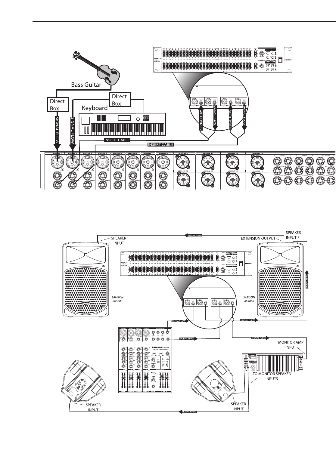 the Channel 2 INPUT and OUTPUT are inserted on a keyboard channel using the same type of cable. For more information on cable wiring