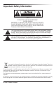 Important Safety Information AVIS RISQUE DE CHOC ÉLECTRONIQUE NE PAS OUVRIR WARNING: TO REDUCE THE RISK OF ELECTRIC SHOCK, DO NOT REMOVE COVER (OR BACK) AS THERE ARE NO USER-SERVICEABLE PARTS INSIDE. REFER SERVICING TO QUALIFIED SERVICE PERSONNEL. This lightning flash with arrowhead symbol within an equilateral triangle is intended to alert the user to the presence of non-insulated “dangerous voltage” within the product’s enclosure that may be of sufficient magnitude to constitute a risk of electric shock.