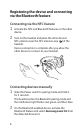 Registering the device and connecting via the Bluetooth feature Connecting via the NFC feature 1 Activate the NFC and Bluetooth features on the other device. 2 Turn on the headset and place the other device’s NFC antenna near the NFC antenna area ( ) of the headset. Device connection is complete after you allow the other device to connect to your headset. Connecting devices manually 1 Slide the Power switch to pairing mode and hold it for 3 seconds.