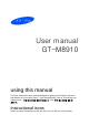 User manual GT-M8910 using this manual This user manual has been specially designed to guide you through the functions and features of your mobile phone. To get started quickly, refer to “introducing your mobile phone,” “오류! 참조 원본을 찾을 수 없습니다.,” and “오류! 참조 원본을 찾을 수 없습니다..