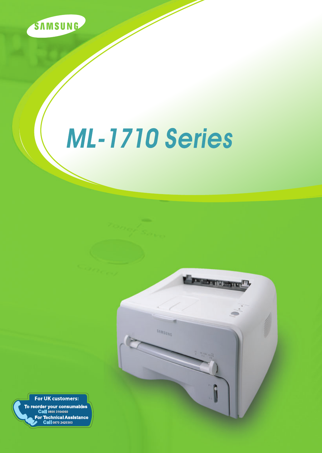 This manual is provided for information purposes only. All information included herein is subject to change without notice. Samsung Electronics is not responsible for any damages, direct or indirect, arising from or related to use of this manual. © 2003 Samsung Electronics Co., Ltd. All rights reserved. • ML-1710 Series and Samsung logo are trademarks of Samsung Electronics Co., Ltd. • Centronics is a trademark of Centronics Data Computer Corporation.