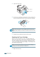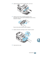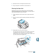 2 Remove the jammed paper by gently pulling it straight out. 3 Replace the toner cartridge and close the front cover. Printing automatically resumes. In the Manual Feeder “Bypass Jam” appears on the display when you try to print using the manual feeder and the machine does not detect paper, due to no paper or improper paper loading. The error message may also occur when the paper is not properly fed into the machine through the manual feeder. In that case, pull the paper out of the machine. 9.