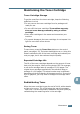 Printing Quality Problems The dirty inside of the machine or improper paper loading may reduce the print quality. See the table below to clear the problem. Condition Suggested solutions Light or faded print If a vertical white streak or faded area appears on the page: • The toner supply is low. You may be able to temporarily extend the toner cartridge life. See “Redistributing Toner” on page 8.7. If this does not improve the print quality, install a new toner cartridge.