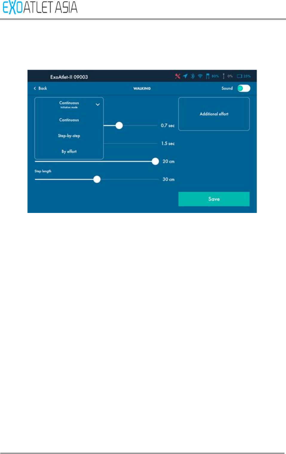 “Walking” button on Training screen – after 3 beeps exoskeleton starts continuous
