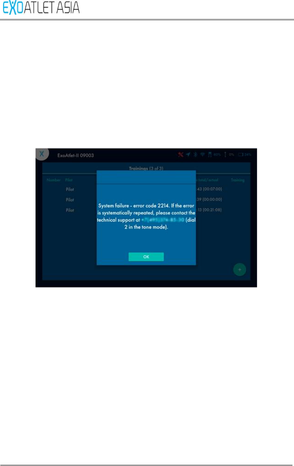 appears on the screen. Exoskeleton will automatically send a stop command and if
