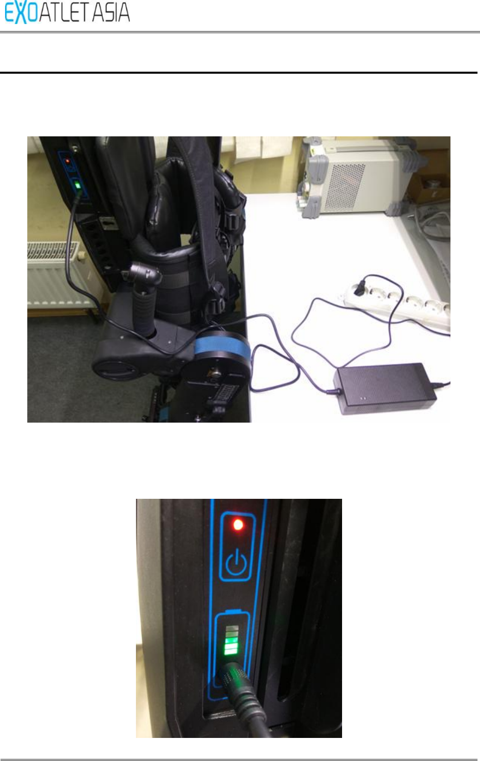 exoskeleton and LED bar on the exoskeleton will show the current charge (1 bar