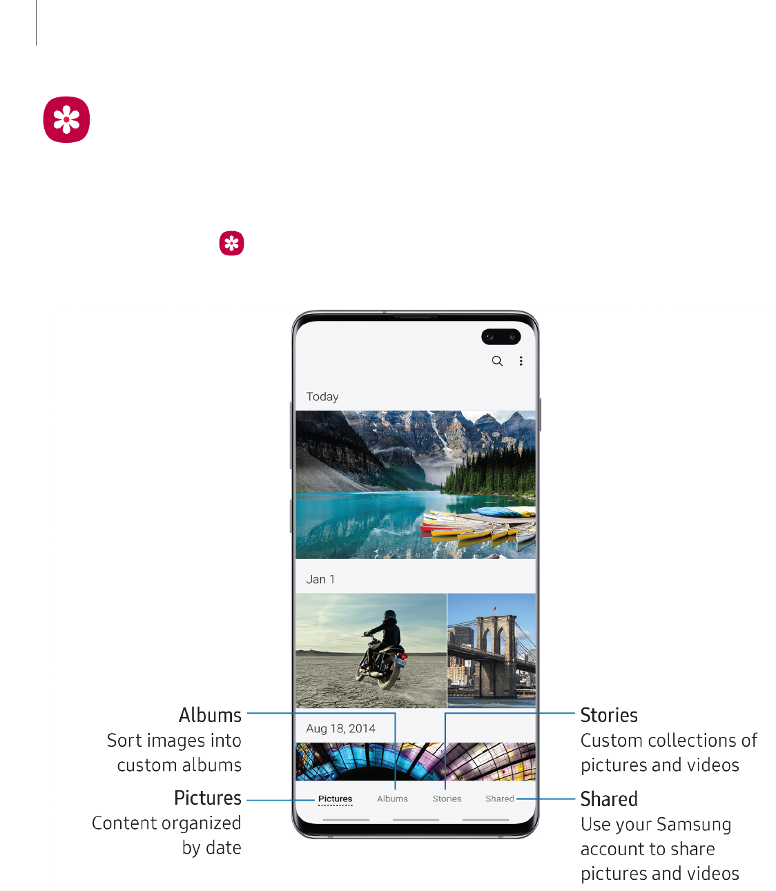 Go to the Gallery to look at photos and videos stored on your device. You can view,