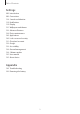 Table of Contents Settings 106 106 118 119 119 121 122 124 126 126 131 133 133 134 134 135 135 Introduction Connections Sounds and vibration Notifications Display Wallpapers and themes Advanced features Device maintenance Applications Lock screen and security Cloud and accounts Google Accessibility General management Software update User manual About device Appendix 136 Troubleshooting 142 Removing the battery 3