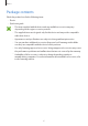 Basics Device and data management Connecting the device to a computer for data transfer Move audio, video, image, or other types of files from the device to the computer, or vice versa. Do not disconnect the USB cable from the device when you are transferring files. Doing so may cause data loss or device damage. The devices may not connect properly if they are connected via a USB hub. Directly connect the device to the computer’s USB port. 1 2 Connect the device to the computer using the USB cable.