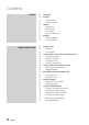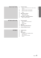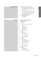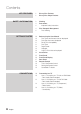 Contents English Setup 40 40 40 40 41 41 41 41 41 41 41 42 Language Security Parental Rating Change Password General Background Energy Saving Front Display Power On/Off Sound Support Software Upgrade Contact Samsung Basic Functions 43 43 43 43 43 43 43 44 44 44 44 44 44 44 45 45 45 45 45 46 46 46 46 47 Playing a Disc Playback Disc Structure Using the Disc menu/Title menu/Popup menu Using the Disc Menu Using the Title Menu Playing the Title List Using the Popup Menu Using the Search and Skip Functi