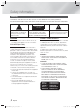 Safety Information Warning TO REDUCE THE RISK OF ELECTRIC SHOCK, DO NOT REMOVE THE COVER (OR BACK). NO USER-SERVICEABLE PARTS ARE INSIDE. REFER SERVICING TO QUALIFIED SERVICE PERSONNEL. CAUTION RISK OF ELECTRIC SHOCK DO NOT OPEN The lighting flash and Arrowhead within the triangle is a warning sign alerting you of dangerous voltage inside the product. CAUTION: TO REDUCE THE RISK OF ELECTRIC SHOCK, DO NOT REMOVE COVER (OR BACK) NO USER SERVICEABLE PARTS INSIDE.