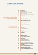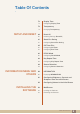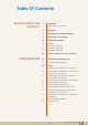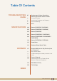 Table Of Contents BEFORE USING THE PRODUCT PREPARATIONS 7 Copyright 7 Icons used in this manual 8 Cleaning 9 Securing the Installation Space 9 Precautions for storage 10 Safety Precautions 10 11 12 14 Symbols Electricity and Safety Installation and Safety Operation and Safety 18 Correct posture to use the product 19 Checking the Components 19 Checking the Components 21 Parts 21 23 Frontal Buttons (S22E450F / S24E450F) Frontal Buttons (S24E650PL / S24E650XL / S24E650XW / S27E650X) F