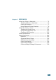 CONTENTS Chapter 1: INTRODUCTION Special Features .................................................. Printer Components ............................................. Front View ..................................................... Inside View .................................................... Rear View ...................................................... 1.2 1.4 1.4 1.5 1.5 Understanding the Control Panel ............................ 1.6 On Line/Error and Toner Save LEDs ................... 1.