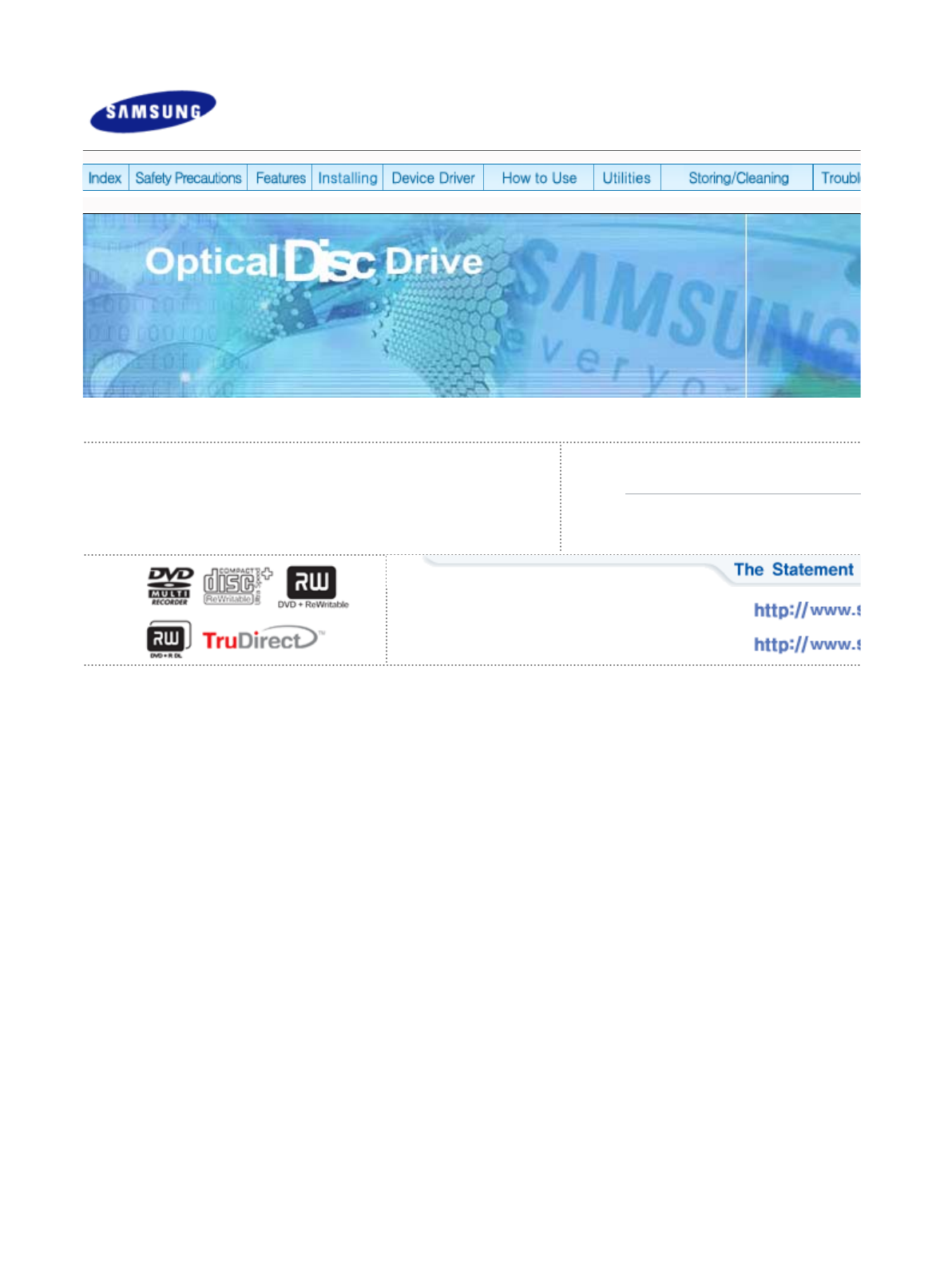 SAMSUNG DVD Writer User Manual 페이지 1 / 1 Select Model SH-S223C(TS-H663C) Select Languages English While the LED indicator is blinking green, do not turn the PC off, nor disconnect the DVD Writer. Otherwise it may cause damage to the drive. How to Use a Horizontally Installed Drive You can use 3.15 Inch or 4.72 Inch (8cm or 12cm) disc. The drive cannot read the disc properly if any part of the disc is placed outside the tray guiding line.