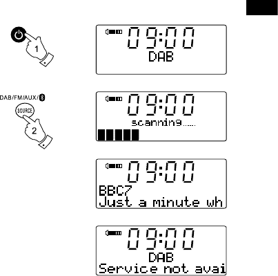 2. Press and release the Source button to select DAB mode. The display will show “DAB” for a