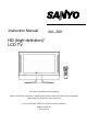 Instruction Manual AVL-209 HD (high-definition)* LCD TV * HD Cable or Satellite receiver required. Before connecting, operating or adjusting this product, please read the manual completely. Please keep this manual for future reference. Call our HELPLINE 1-800-263-2244 for further assistance. SANYO Canada Inc. www.sanyo.