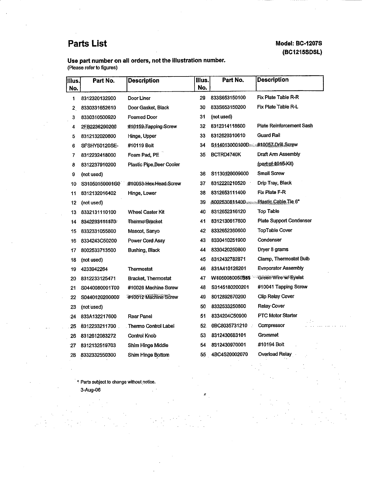Parts List Model: BC-12078 (BC12158DSL) Use part number on all orders, not the Frustration number. {Please refer to figures) Mus. Part No. Description {Hus. Part No. Description No. No. 1 8312820132900 Door Liner 29 8338653150100 Fix Plate Table R-R 2. 8330331852610 Door Gasket, Black 30 $33$653150200 Fix Plate Table R-L.