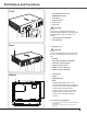 Part Names and Functions Front ① Infrared Remote Receiver ② WIRELESS Indicator ③ Focus Ring ④ Projection Lens ⑤ Zoom Lever ⑥ Lens Cap CAUTION ① ② ③ ④ ⑤ ⑧ ⑥⑦ ⑧ Back Do not turn on a projector with lens cap attached. High temperature from light beam may damage lens cap and result in fire hazard. ⑦ Top Controls and Indicators ⑧ Air Intake Vent ⑨ Exhaust vent ⑨ CAUTION Hot air is exhausted from the exhaust vents. Do not put heat-sensitive objects near this side.